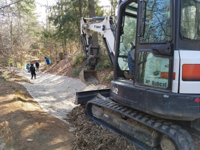 Volunteers from a local snowmobile club and the community at large pitched in to help a severely damaged trail on Scarborough Land Trust’s Fuller Farm Preserve, a well-loved conservation property…