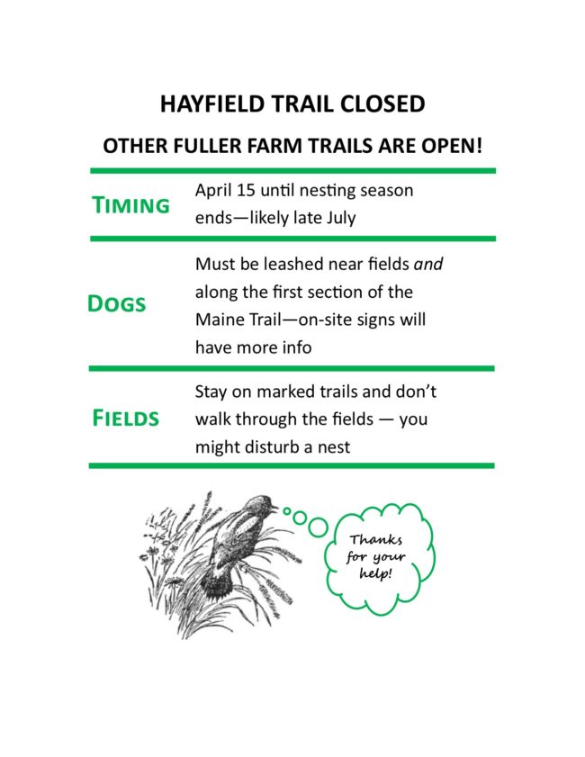 Fuller Farm is a destination – not just for hikers, but for ground nesting birds, especially bobolinks. To help support these birds, the Hayfield Trail and all fields will be…
