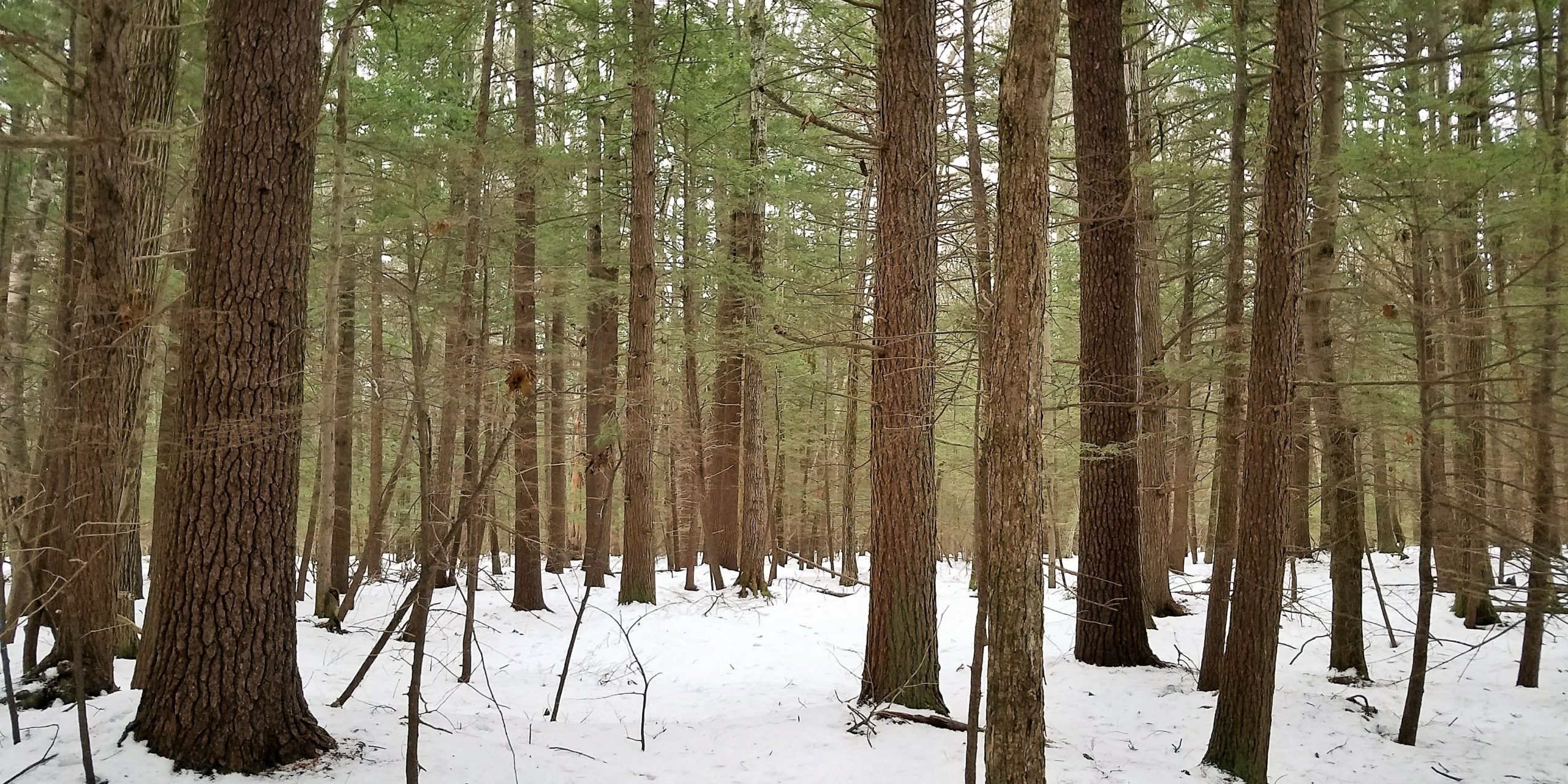 I started paying more attention to the forest structure as I walked the first part of the trail, called the Bruce Lincoln loop. As I got farther from the roadside, the habitat changed from a relatively mixed age forest to a mature conifer forest. The majority of the trees were tall and old, with almost no young trees growing up underneath. This told me that the forest canopy, or upper layer of evergreen needles (primarily hemlock and white pine, with some red spruce), was dense enough to shade the forest floor. It would also intercept some of the snow, making it easier for animals below to get around. This is the key to a deer yard. When winter closes in each year, if snow depths in the fields accumulate above 12 to 18 inches, deer begin to migrate to a deer yard. These are places that are apparently known by the elder deer, who pass this traditional knowledge on to younger deer. Snow depths inside a deer yard can be half as deep as out in the open. Moreover, when deer congregate inside a deer yard, they save energy when they stick to trails that they have all created, rather than punching in new trails all the time