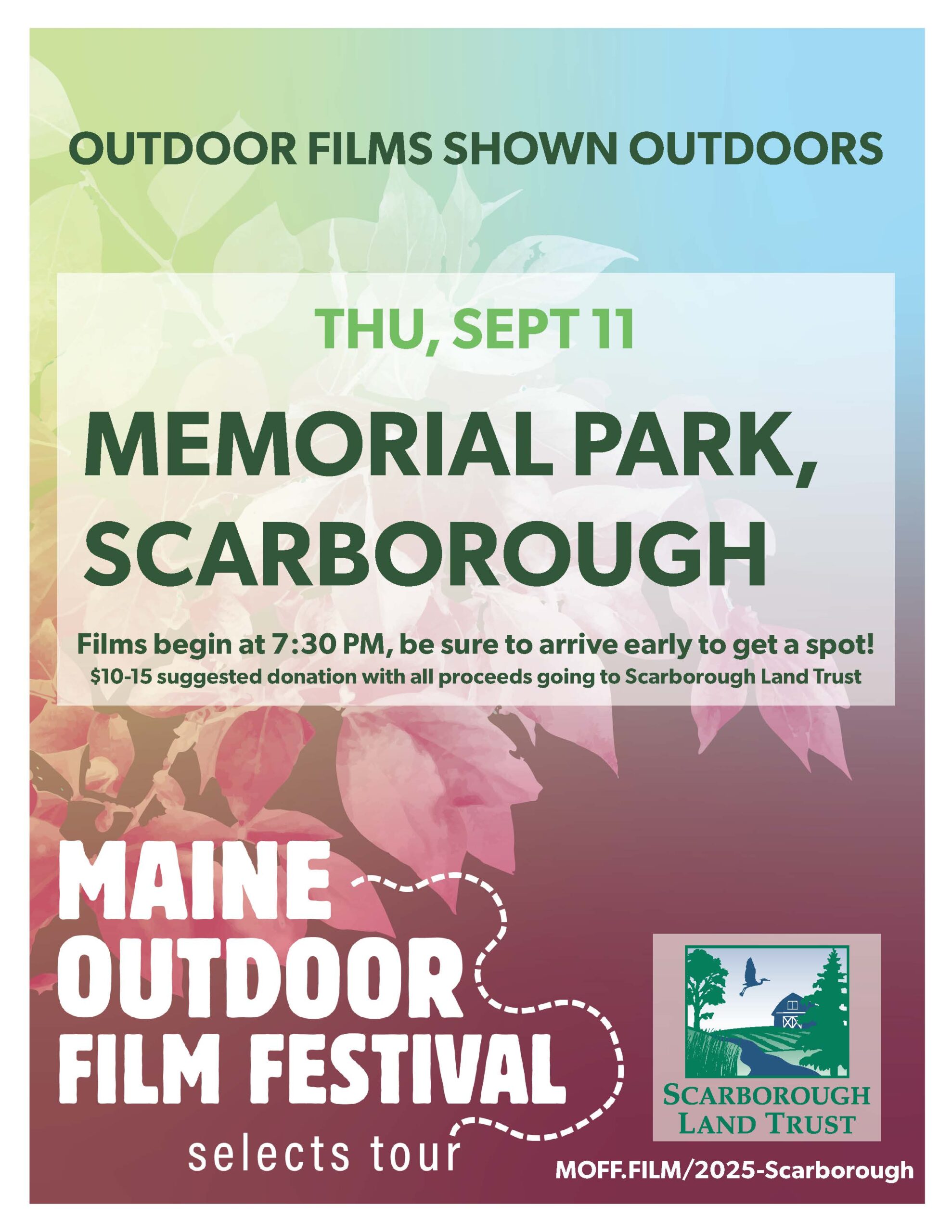 Enjoy outdoor films from across Maine and around the world at the Maine Outdoor Film Festival event in Scarborough. Meet us at Memorial Park for an exciting evening full of outdoor adventure and conservation films. Films start at 7:30 so be sure to arrive early to get a spot! For more information, including the evening’s lineup of films, please visit Memorial Park • MOFF – Maine Outdoor Film Festival