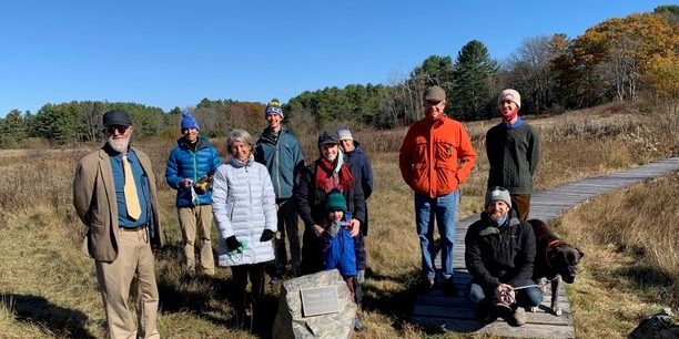 Phineas Sprague, founding Board Member and Treasurer of Scarborough Land Trust, was honored and remembered at a naming ceremony for the “Phin Sprague Boardwalk” in Swallows Field at Pleasant Hill Preserve on October 31st.