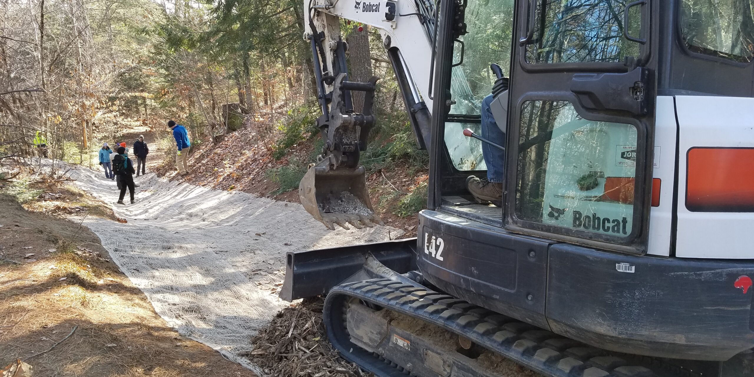 Volunteers from a local snowmobile club and the community at large pitched in to help a severely damaged trail on Scarborough Land Trust’s Fuller Farm Preserve, a well-loved conservation property on Broadturn Road. If you haven’t visited, you should! The trails offer a great opportunity for getting outdoors, whether you want to take a gentle stroll across the rolling former hayfields, go on a peaceful run, or walk your dog to the waterfall in the heart of the property.